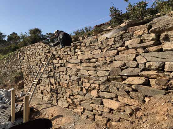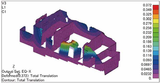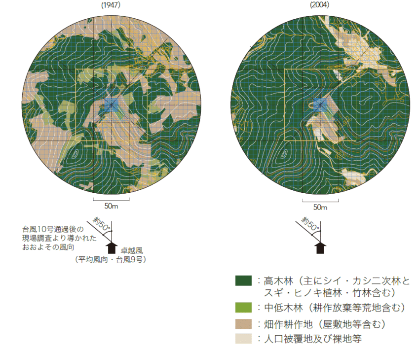 Surveying Studio 臨床としてのデザイン Design as Clinical Practice D4H にとってのフィールドは、臨床現場である。遺産の診察は机上ではなく、身体に直接触れるように始まる。3DスキャンはCTであり、風況解析は呼吸機能検査のようなものである。非侵襲的に「いまの状態」を明らかにすることがまず必要になる。「なぜ歪んでいるのか」「どう風が抜けるのか」を問うことが思考の始まりであり、診るという行為そのものがデザインである。ここで重要なのは「最小限介入(minimumintervention)」の原則である。遺産を人体のように扱い、不可逆な処置を避け、本当に必要なことを見極める。現場に立ち会い、身体スケールで診断する、その臨床的アプローチの積み重ねがD4Hの実践である。 補強前構造解析大きく傾斜した壁も根元から解体せず、油圧ジャッキにより立て起こし、天端付近の浮いた石の部分解体修理と風化の進んだ目地の詰め直しにとどめ、廃墟としての現状を保存することとし、あくまでも「復元」は行わないという方針のもと設計を進めた。変異の大きい東面の石積は開口上部のまぐさレベルに鉄骨臥梁を仕込み補強。大平エリアの風況解析台風による海からの強風によって仮説の素屋根が被害を受けた経緯から実施した。その結果、主構造を木造軸組+鉄骨フィーレンディールから、鋼管柱+集成材格子梁に変更。軒高を下げ、軒の出をなくし、ポスト柱の追加といった変更を行った。大平エリアの2004 年(右)と1947 年(右)の植生調査かつては一面畑として開墾されていたが、時間の経過と共に森にかえってしまっていた。広域で見ると昔に比べ一帯の風速は落ちるが、スケールを上げて見ると再開墾したことで作業場跡周辺だけが裸地として残り、地表付近の風速はむしろ上昇する傾向が見られた。 測量・調査機器一覧 形をとらえる 測量三次元レーザー測量機Leica RTC3601台 トータルステーションTS16 I 3" R1000, imaging total station1台 写真測量用ドローンDJI-Phantom 4 RTK1台 GNSSステーションDJI-D-RTK21台 高精度GNSS受信機内蔵対空標識エアロボマーカー(AS-GM01)4台 オートベルNikon AE-71台 レーザー墨出し機Bosch GLL8-40E1台 三脚Leica 高精度木製三脚2台 Myzox 高精度木製三脚1台 軽量木製三脚4台 整準台Myzox4台 図化用ペンタブレットXP-pen Artist241台 流れをとらえる 水文観測気圧/温度計S&DL mini バロメータ1台 絶対圧水位計S&DL mini 4900(大気圧)5台 力をとらえる 地盤調査貫入試験機簡易動的コーン貫入試験機1台 時間をとらえる 撮影動画/静止画撮影カメラGo Pro HERO 101台 FUJIFILM XT-31台 Lumix DC-FT7-K1台 360°カメラnsta 360 X21台 カメラジンバルDJI RS 3 Mini1台